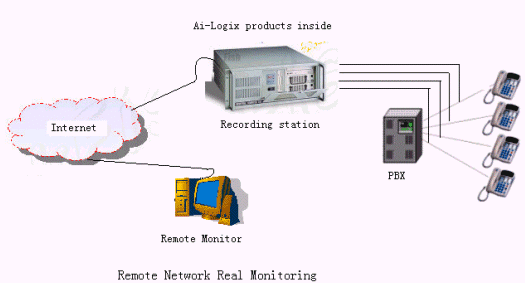 如上圖,在Recording Station 中裝有支持MVIP總線的Ai-Logix系列錄音卡.Recording Station通過Ai-Logix系列錄音卡搭線在被監(jiān)聽的電話線上,采用高阻錄音技術(shù),取得通話的錄音數(shù)據(jù),再由Internet實時傳給Remote