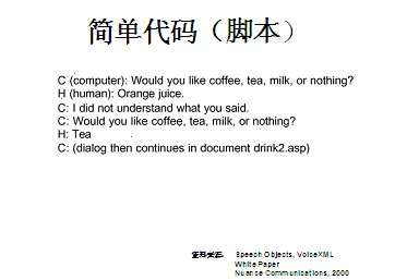 世界上最古老的用戶界面--人類(lèi)語(yǔ)言終于在二十一世紀(jì)借助于VoiceXML,一種語(yǔ)音可擴(kuò)展標(biāo)記語(yǔ)言發(fā)展成熟起來(lái)。作為世界上第一個(gè)真正的語(yǔ)音通信標(biāo)準(zhǔn),它定義了應(yīng)用開(kāi)發(fā)商向用戶提供新型信息訪問(wèn)服務(wù)的方式。通過(guò)這種服務(wù),用戶在任何地方,都可以通過(guò)電話或任何移動(dòng)設(shè)備,虛擬訪問(wèn)任何信息。VoiceXML正在被廣泛應(yīng)用于旅游、金融與信息服務(wù)等行業(yè)的各種業(yè)務(wù)領(lǐng)域中,甚至是政府部門(mén)與市政機(jī)構(gòu),全球的無(wú)線運(yùn)營(yíng)商等。