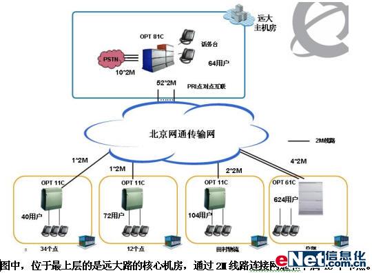 新的網(wǎng)絡(luò)建成以遠(yuǎn)大路中心機(jī)房為核心的星形網(wǎng)絡(luò),租用北京網(wǎng)通2M專線的方式同各個(gè)門市店連接。各個(gè)門市店設(shè)立了自己的程控交換機(jī),并通過E1中繼方式和核心機(jī)房實(shí)現(xiàn)全網(wǎng)互聯(lián)。在此方案中,所有的市話呼入和呼出都通過核心節(jié)點(diǎn)同網(wǎng)通之間的中繼通道,從而實(shí)現(xiàn)大中電器內(nèi)部話音通訊的統(tǒng)一編號(hào)方案、統(tǒng)一撥號(hào)規(guī)則、統(tǒng)一維護(hù)和管理;并對外公布公開和便于記憶的號(hào)碼,以配合網(wǎng)點(diǎn)的促銷活動(dòng),以及未來客戶服務(wù)等應(yīng)用的擴(kuò)展。