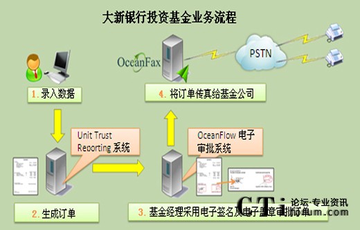 大新銀行Information Technology Division作出多方研究及比較,最終選定OceanX旗艦產(chǎn)品、市場(chǎng)增長第一并屢獲殊榮的OceanFax傳真服務(wù)器作為電子傳真工具;并與Unit Trust Reporting系統(tǒng)及OceanX另一旗艦產(chǎn)品OceanFlow電子審批系統(tǒng)整合,理順投資基金業(yè)務(wù),實(shí)現(xiàn)自動(dòng)流程,包括訂單生成、審批及傳真發(fā)送流程。