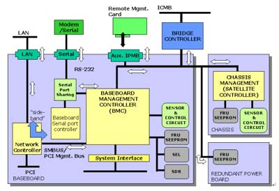Controller (BMC)。它通過各別的界面來管理整個系統(tǒng),如系統(tǒng)狀態(tài)偵測及事件過濾、電源管理、記錄事件發(fā)生時間及系統(tǒng)回復(fù)控制,并且透過網(wǎng)絡(luò)或串行端口來告知管理人員,另外,它提供了IPMB的總線來和外部的管理控制器互相溝通。