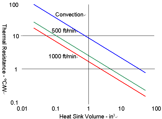 從圖上可以看出散熱片的散熱能力并不和風(fēng)速成一線性函數(shù),在熱阻上一個(gè)非常顯著的改善,會(huì)在稍呈對(duì)流狀態(tài)的空氣與每分鐘500英尺的風(fēng)速情況下顯現(xiàn)出來(lái),但是從每分鐘500英尺增加到每分鐘1000英尺的風(fēng)速時(shí),熱阻的改善就沒(méi)那么顯著了。另一個(gè)用吹風(fēng)方式的限制因素是噪音,當(dāng)吹過(guò)卡板與散熱片的風(fēng)速增加時(shí),所產(chǎn)生的噪音也會(huì)增加。從實(shí)務(wù)面來(lái)看,大部分的CompactPCI機(jī)箱提供每分鐘300英尺的風(fēng)速,如先前提到的,散熱片通常會(huì)被內(nèi)存以及PMC的空間給限制了大小,一個(gè)CompactPCI卡板若含有兩個(gè)PMC的設(shè)計(jì),通常會(huì)有一個(gè)處理器散熱片的大小約為3