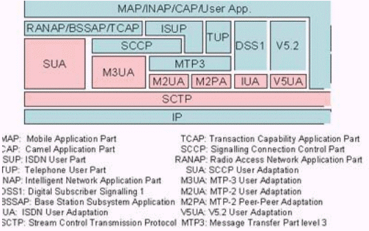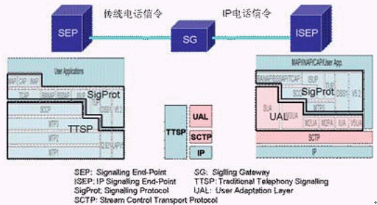 圖中粉紅色部分為SIGTRAN的協(xié)議棧,在它們之上的是對(duì)應(yīng)的電話信令協(xié)議。SIGTRAN的協(xié)議棧分為2層:一層是SCTP,它提供多個(gè)流的,可靠的數(shù)據(jù)傳輸,用戶數(shù)據(jù)的捆綁和分段,阻塞和流量控制,防止"拒絕服務(wù)"和"偽裝"的攻擊等功能。另一層是用戶適配層,圖中由SUA、M3UA、M2UA、M2PA、IUA和V5UA五個(gè)適配模塊所組成,它們分別來(lái)滿足各種電話信令協(xié)議適配的要求。