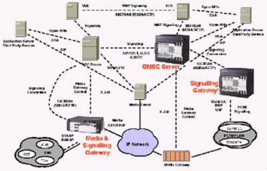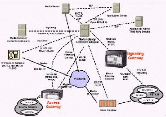 本例中的媒體網(wǎng)關(guān)控制器(MGC)終結(jié)所有的信令,包括直接傳輸?shù)暮屯ㄟ^(guò)IP的信令,完成如一個(gè)SIP電話向PSTN網(wǎng)絡(luò)發(fā)送信號(hào)之類的信令互通,還對(duì)打到VoIP網(wǎng)絡(luò)的呼叫進(jìn)行鑒權(quán)和選擇路由,并提供計(jì)費(fèi)信息。這個(gè)MGC還通過(guò)SIP/SIP-T,H.323或Q.BICC與其他的MGC通信。
