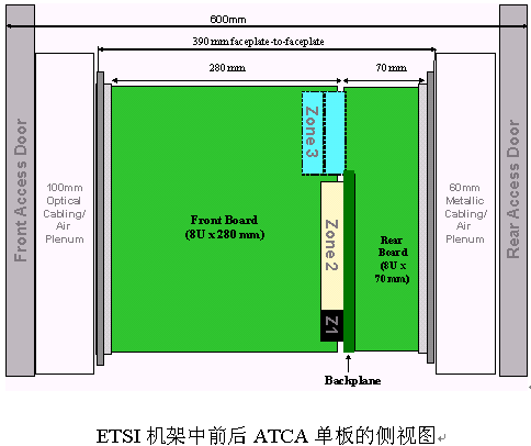PICMG 3.0機(jī)構(gòu)要求主要來自于對(duì)600mm ETSI 和19" EIA標(biāo)準(zhǔn)機(jī)柜空間使用的研究。PICMG 3.0委員會(huì)在考慮單板尺寸能支持下一代元器件對(duì)物理和散熱的需求的同時(shí),機(jī)箱空間能和板子能達(dá)到最大限度的配合和利用。最初的工作是基于歐規(guī)卡的標(biāo)準(zhǔn),繼而又提升到支持低成本的片狀金屬架構(gòu)(簡(jiǎn)單電訊封裝)。對(duì)后走線模塊的支持滿足了對(duì)后I/O應(yīng)用的需求。在決定可以使用的單板空間時(shí),也充分考慮了前、后板的進(jìn)深范圍以供大量電纜束綁空間。經(jīng)過對(duì)不同規(guī)格尺寸的單板的優(yōu)點(diǎn)進(jìn)行討論之后,PICMG 3.0組織統(tǒng)一規(guī)格如下:前板 8U x 280mm,進(jìn)深1.2" pitch,選配后板8U x 70mm深;1.2" pitch,19" EIA機(jī)框可以支持14槽,而600mm ETSI的機(jī)框可以支持16槽。下圖所示為600mm ETSI機(jī)架中的ACTA前后單板的側(cè)視圖: