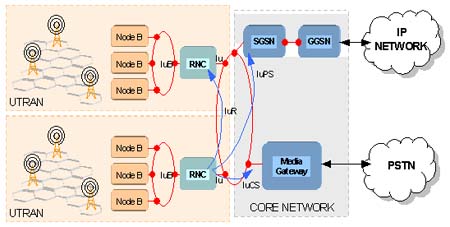 UTRAN為用戶端的移動(dòng)電話、其它無(wú)線設(shè)備(如PDA, 便攜計(jì)算機(jī)等)提供到有線網(wǎng)絡(luò)的連接,它包括B節(jié)點(diǎn)(Node