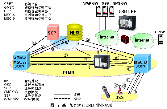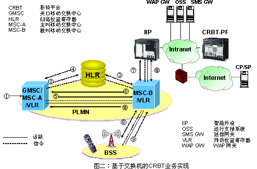 智能網(wǎng)方案對(duì)現(xiàn)有的網(wǎng)絡(luò)改動(dòng)較小,可以快速開展彩鈴業(yè)務(wù)。但是,在現(xiàn)有的智能網(wǎng)網(wǎng)絡(luò)條件下,該方案會(huì)造成話路迂回,占用過多的中繼資源;而且整個(gè)呼叫過程中都要占用CRBT-IP,容易造成話務(wù)負(fù)載過大,限制了CRBT業(yè)務(wù)的用戶數(shù)量。