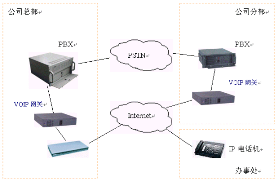 用VOIP網(wǎng)關(guān)構(gòu)建整個(gè)IP電話系統(tǒng)可以采取以下方式(拓?fù)鋱D見下圖):