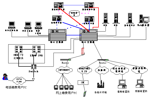 根據(jù)公司業(yè)務(wù)系統(tǒng)的組網(wǎng)方式,提供合適的解決方案,滿(mǎn)足需求,采用全省集中方式,具有以下特點(diǎn):省中心建設(shè)語(yǔ)音處理系統(tǒng)和付費(fèi)平臺(tái)業(yè)務(wù)系統(tǒng)集中在省中心;完全集中管理;完全支持全省漫游繳費(fèi);全省設(shè)備投資較少。