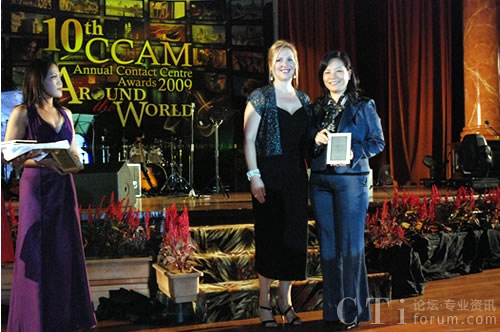 會(huì)議期間,飛翱商務(wù)咨詢有限公司市場(chǎng)與客戶服務(wù)部總監(jiān)王淑信代表中國(guó)從亞太客服與呼叫中心聯(lián)盟(APCCAL)高級(jí)官員的手中接過(guò)了象征著2009亞太呼叫中心行業(yè)最高榮譽(yù)的2009亞太最佳呼叫中心的獎(jiǎng)牌。