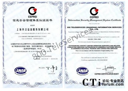 CTI論壇(ctiforum)1月31日消息(記者 浩宇):2012年1月,著名的服務(wù)外包呼叫中心和電子商務(wù)運(yùn)營中心企業(yè)--飛翱集團(tuán)旗下全資子公司上海華泛信息服務(wù)有限公司---,繼2009年獲得ISO9001 質(zhì)量管理體系國際認(rèn)證后。經(jīng)過半年嚴(yán)格的綜合考評,再次成功獲得又一由國際上公認(rèn)的ISO/IEC 27001:2005(也簡稱為:ISO27001)并獲得具有美國認(rèn)證機(jī)構(gòu)國家認(rèn)可委員會ANAB授予的雙重信息安全管理體系認(rèn)證。