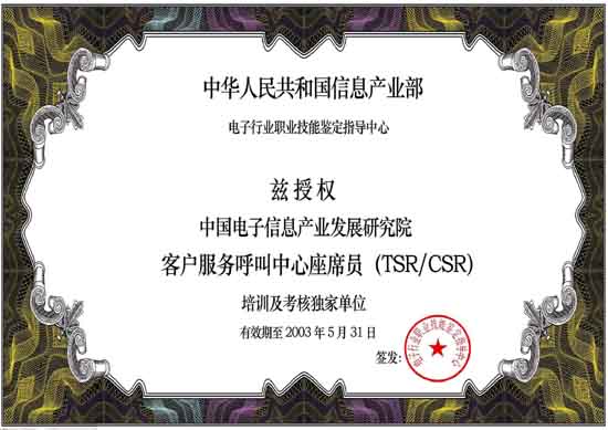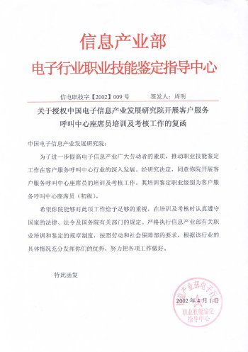 中國電子信息產(chǎn)業(yè)發(fā)展研究院職業(yè)技能培訓部是中國電子信息產(chǎn)業(yè)發(fā)展研究院旗下專業(yè)從事IT職業(yè)技能培訓的機構。呼叫中心職業(yè)技能培訓工作是培訓中心常年開展的主要培訓項目。培訓中心受信息產(chǎn)業(yè)部委托,負責全國范圍內"呼叫中心客戶服務座席員"的授權培訓及考核工作。既是呼叫中心行業(yè)基礎操作人員培訓及考核的權威機構,又是配合行業(yè)管理、全面支撐和提升整個呼叫中心產(chǎn)業(yè)的服務機構。
