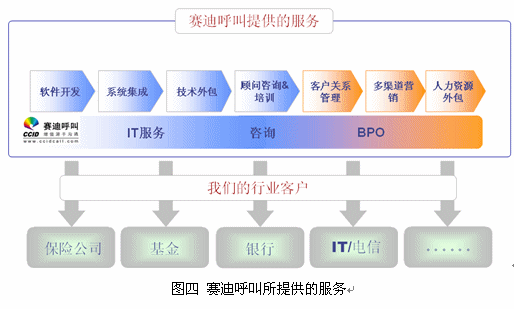 同時(shí),賽迪呼叫所推薦給企業(yè)的并非只是軟件,而是結(jié)合了賽迪呼叫豐富的運(yùn)營(yíng)服務(wù)經(jīng)驗(yàn)、技術(shù)服務(wù)能力的全方位信息化服務(wù)。賽迪呼叫的這種全面的信息化服務(wù),涵蓋IT服務(wù)、咨詢服務(wù)、BPO等,圖四給出了相應(yīng)展示。