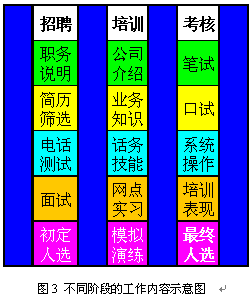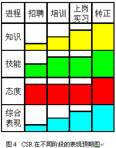 即使經(jīng)過規(guī)范的上崗培訓與考核,新員工通常也只達到老員工70%左右的表現(xiàn)。因此制定明確的實習期,在實習期間加強指導(dǎo)和培養(yǎng)是非常重要的。通常經(jīng)過3個月的實習,新員工已經(jīng)可以達到一個標準,這時便可以轉(zhuǎn)正了。圖3和圖4表現(xiàn)了不同階段對CSR的不同預(yù)期,以及不同階段的主要工作。