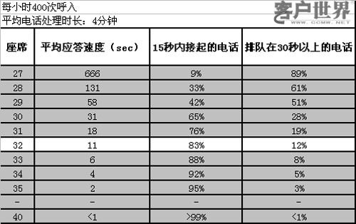 然而,圖3從客戶(hù)感受的角度來(lái)分析問(wèn)題。從客戶(hù)的角度來(lái)看,客戶(hù)聯(lián)絡(luò)中心提供的服務(wù)并沒(méi)有達(dá)到他們期望。對(duì)于每個(gè)來(lái)電者最首要的問(wèn)題是要求在幾秒鐘內(nèi)接通電話(huà)。如果所有的座席都忙碌,這種可能性就會(huì)大大降低了。如果在線(xiàn)座席代表數(shù)量不足,則平均排隊(duì)時(shí)間就會(huì)增加,這將導(dǎo)致客戶(hù)的不滿(mǎn),進(jìn)而將他們的業(yè)務(wù)轉(zhuǎn)向別處。