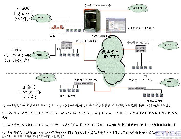套Omni PCX Office(面向中小型機構(gòu)的通信平臺)系統(tǒng)分別為4-160 用戶作為分支交換節(jié)點。全網(wǎng)總計多達6000
