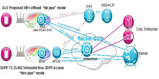 上述方案解決了WiFi分流的認(rèn)證問題,上海貝爾的方案中,將WLAN的GW功能引入到7750 SR業(yè)務(wù)路由器上,該功能通過7750 SR上的AA-ISA多業(yè)務(wù)板卡實現(xiàn)。WiFi分流為確保安全性,在3GPP TS 23.402中,對WiFi終端的接入,采取了一種所謂瘦管道的模式,即要從用戶端向網(wǎng)關(guān)發(fā)起IP-Sec連接,而AP僅充當(dāng)橋的作用,對于PC或平板電腦等終端,這不是什么問題,但對于手機(jī)而言,IP-Sec將帶來非常大的負(fù)荷,不僅影響終端上應(yīng)用的相應(yīng)速度,同時對電池的消耗非常之大,就目前情況看,市場上支持該功能的手機(jī)非常少。上海貝爾的方案中,采用了胖管道的模式,通過從AP向網(wǎng)關(guān)建立IP-Sec或GRE隧道,顯著降低了對移動終端的要求,不僅使得移動終端的成本得以下降,同時延長了終端的使用時間,更重要的是,擴(kuò)大了運營商推廣WiFi 分流方案的適用群體。