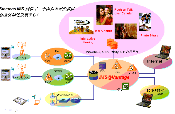 西門子IP多媒體子系統(tǒng)名為IMS@vantage,它完全遵循3GPP規(guī)范,提供了一個(gè)支持語音/多媒體數(shù)據(jù)業(yè)務(wù)集成的開放式網(wǎng)絡(luò)控制平臺(tái),能為運(yùn)營(yíng)商以最經(jīng)濟(jì)快捷的方式提供多媒體應(yīng)用及開發(fā)環(huán)境。