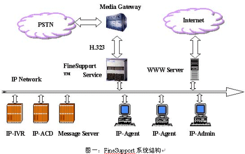 Finesupport是一個(gè)完全基于IP網(wǎng)絡(luò)的呼叫中心,不同于智能網(wǎng)應(yīng)用或CTI應(yīng)用。其應(yīng)用建立在Soft Switch體系之上,媒體流總是在第一時(shí)間被報(bào)文化,成為數(shù)據(jù)流,此后整個(gè)應(yīng)用系統(tǒng)中處理的完全是數(shù)據(jù),主要通過軟件來實(shí)現(xiàn),因而在降低成本、開展新業(yè)務(wù)、平滑升級(jí)方面具有極大的優(yōu)勢(shì)。
