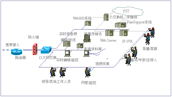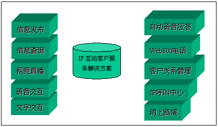 經(jīng)過對(duì)比分析,我們發(fā)現(xiàn),目前國(guó)際國(guó)內(nèi)市場(chǎng)上很多客戶服務(wù)產(chǎn)品,大都僅僅完成客戶服務(wù)的一部分。北極星“IP互動(dòng)客戶服務(wù)中心解決方案”則引入互動(dòng)客戶服務(wù)(ICS:Interactive Customer Service)系統(tǒng)以及數(shù)碼互動(dòng)直播的概念,形成了由視頻點(diǎn)播、網(wǎng)上路演、語音和文字交互、IP客戶服務(wù)中心、Web800語音電話、實(shí)時(shí)服務(wù)中心、專家實(shí)時(shí)在線、客戶關(guān)系管理、在線尋呼系統(tǒng)和客戶社區(qū)服務(wù)系統(tǒng)等全方位的服務(wù)內(nèi)容。該方案主要基于IP架構(gòu),系統(tǒng)擴(kuò)展性非常靈活,系統(tǒng)體現(xiàn)的客戶服務(wù)思想非常能夠滿足我們的需求。2001年3月,經(jīng)過一段時(shí)間的試運(yùn)行后,我們正式推出了這套“IP互動(dòng)客戶服務(wù)”系統(tǒng)。