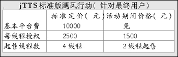 jTTS標(biāo)準(zhǔn)版在聲音質(zhì)量、聲音平滑度、自然度等方面已具有比較高的實用化水平。為了真正啟動語音技術(shù)的應(yīng)用市場,捷通華聲啟動“颶風(fēng)行動”,在活動期間為最終客戶、系統(tǒng)集成商制定了一個極具競爭力的價格,并且無平臺費。這次活動主要針對CTI領(lǐng)域中大量中小型系統(tǒng)的應(yīng)用開展此次活動,目的是讓先進(jìn)的技術(shù)能夠被更多的用戶采用,為系統(tǒng)集成商應(yīng)用TTS技術(shù)提供了很高的利潤空間。