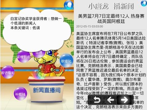 CTI論壇(ctiforum)5月17日消息(記者 歐陽): 2012年5月9日,中國第一個(gè)全方位智能交互手機(jī)助手“小唐龍”正式上線,小唐龍是一個(gè)基于Android系統(tǒng)的智能手機(jī)助手,它可隨時(shí)隨地幫助手機(jī)用戶進(jìn)行聊天、歌曲點(diǎn)播、聽新聞、地圖導(dǎo)航、互聯(lián)網(wǎng)信息查詢等多方面服務(wù),其中《唐龍新聞》以新穎獨(dú)特成為小唐龍的閃亮點(diǎn)。當(dāng)拿起手機(jī)對著“小唐龍”說,“聽新聞”,“小唐龍”的播報(bào)便即刻開始——天下大事早知道,由我唐龍給您報(bào),我們來看今天的唐龍新聞。