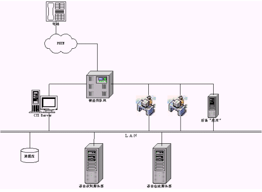IVR模式是最常見(jiàn)的一種模式,這種模式也可以結(jié)合應(yīng)用到前端以交換機(jī)接入的系統(tǒng)中去,在系統(tǒng)的IVR服務(wù)流程上,做出相應(yīng)的修改,加入語(yǔ)音識(shí)別技術(shù),同樣可以得到成功應(yīng)用。另外一種模式暫且稱(chēng)它為后備模式,該模式一個(gè)主要的特點(diǎn)是放在后端,比如在有座席接聽(tīng)的情況下,采用語(yǔ)音識(shí)別技術(shù)的系統(tǒng)不被激活,也就是系統(tǒng)不給派線。當(dāng)系統(tǒng)繁忙,而座席都占用的情況下,系統(tǒng)派線到采用語(yǔ)音識(shí)別技術(shù)的系統(tǒng),如同一個(gè)備用的座席。在這樣一個(gè)"座席"的軟件設(shè)計(jì)上,如同與人的交談一樣,系統(tǒng)也提出正常的詢(xún)問(wèn),但必須強(qiáng)調(diào)引導(dǎo)用戶(hù)來(lái)按照事先設(shè)定好的流程進(jìn)行。這樣可以保證系統(tǒng)的接通率,特別是在一些對(duì)接通率和服務(wù)及時(shí)性要求比較高的場(chǎng)合采用,典型的代表如電信114查號(hào)臺(tái)和移動(dòng)的1860客服中心,這些系統(tǒng)往往是隨著用戶(hù)急劇增加,撥打量也在穩(wěn)步上升,而呼叫響應(yīng)要求及時(shí)。系統(tǒng)拓?fù)浣Y(jié)構(gòu)如下圖示。