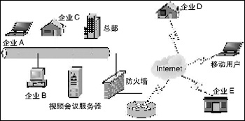 ● Conference可以滿足企業(yè)用戶桌面和會議室級別會議的需求,并且在一個系統(tǒng)中,可以同時進行多個會議而互不干擾,使應用更加方便,典型的應用示意圖如下所示: