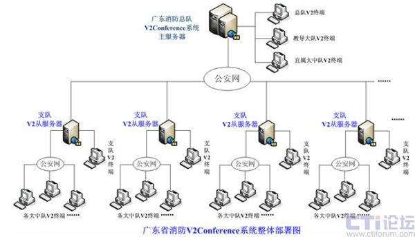 整體系統(tǒng)采用服務器級聯(lián)架構部署,在總隊網(wǎng)絡中心部署了主服務器,全省各地市21個支隊,每個支隊部署1臺v2從服務器,與總隊主服務器進行級聯(lián),所有從服務器下面每個大、中隊分別作為一個終端節(jié)點接入支隊從服務器,教導大隊及總隊直屬特勤大隊直接接入總隊服務器,所用傳輸線路為總隊現(xiàn)有的公安網(wǎng)絡資源。通過目前整個v2系統(tǒng)的部署完成了廣東消防全省300多點終端會場的同時接入,在這個遠程教育系統(tǒng)平臺之上,可以同時召開總隊對支隊的會議,支隊對所屬大中隊的會議,多點即時交流會議,會議和會議之間互不影響,獨立開展。在大數(shù)量終端同時參與同一會議時,V2conference系統(tǒng)的級聯(lián)功能可以有效地將服務器資源進行整合,以適應更大規(guī)模的會議應用,并通過多服務器來均衡整體系統(tǒng)壓力,使系統(tǒng)更加穩(wěn)定。