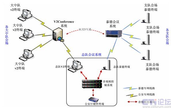 另外在廣東省消防信息系統(tǒng)內,現(xiàn)有硬件泰德電視電話會議系統(tǒng)共有23個終端節(jié)點,主要基于獨立的IP專用網(wǎng)絡,并與V2conference系統(tǒng)所在IP網(wǎng)絡相互獨立。為了達到和硬件系統(tǒng)共用互通,實現(xiàn)全網(wǎng)會議互通,在總隊會議系統(tǒng)中,將會議系統(tǒng)一級網(wǎng)(省公安廳——消防總隊)、二級網(wǎng)(消防總隊——支隊)、三級網(wǎng)(消防支隊——消防大中隊)通過消防總隊會議控制系統(tǒng)和v2conference系統(tǒng)自帶的H.323互通功能模塊融合到一起。