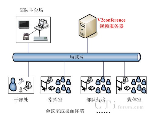 V2視頻會議系統(tǒng)建立在森警部隊專網(wǎng)的基礎(chǔ)上,各區(qū)作戰(zhàn)部隊會議室、指揮室和部隊營房會議均為光纖100M接入,每個中隊官兵營房都集中建立了培訓(xùn)會議室,負責(zé)日常新兵的培訓(xùn)教育。在現(xiàn)有的網(wǎng)絡(luò)基礎(chǔ)上構(gòu)建了V2視頻會議系統(tǒng),來滿足各個中隊和教導(dǎo)大隊的網(wǎng)絡(luò)會議和培訓(xùn)需求。在每個節(jié)點會議室部署了電視、攝像頭和相關(guān)音響設(shè)備,目前已經(jīng)建成10多個網(wǎng)絡(luò)會議節(jié)點的遠程視頻培訓(xùn)系統(tǒng)。