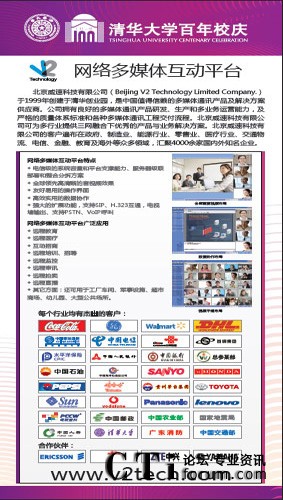 CTI論壇(ctiforum)5月3日消息(記者 張潔): 天行健,君子以自強(qiáng)不息,地勢坤,君子以厚德載物。2011年4月23日,清華大學(xué)迎來百年華誕。在建校百年之際,V2威速聯(lián)合母校----清華大學(xué)百年校慶辦展出了V2網(wǎng)絡(luò)多媒體互動(dòng)平臺。V2威速眾多旗艦產(chǎn)品之一----V2網(wǎng)絡(luò)多媒體互動(dòng)平臺始創(chuàng)于1999年清華大學(xué)第二屆“大學(xué)生創(chuàng)業(yè)比賽”。同年,V2威速于清華創(chuàng)業(yè)園創(chuàng)立,經(jīng)過11年的發(fā)展,V2威速已是中國值得信賴的多媒體通訊產(chǎn)品及解決方案供應(yīng)商。