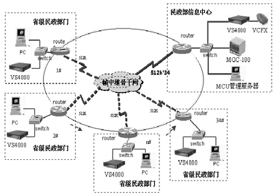 構(gòu)成此次民政部門視頻會(huì)議系統(tǒng)的主要設(shè)備是PolyCom公司的MGC-100多點(diǎn)控制單元(MCU)和VS4000機(jī)架式視頻終端。