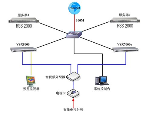 應(yīng)急備份:此系統(tǒng)中服務(wù)器1和服務(wù)器2互為備份;VSX8000和VSX7000e互為備份。RSS2000分配公網(wǎng)IP以便用戶通過(guò)互聯(lián)網(wǎng)接收直播和點(diǎn)播,兩臺(tái)服務(wù)器的地址同時(shí)發(fā)布在網(wǎng)站上。