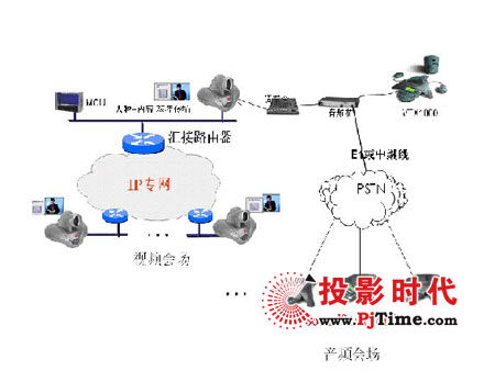 以上拓?fù)鋱D為某單位建立的一套視頻會(huì)議系統(tǒng),會(huì)場(chǎng)地理?xiàng)l件比較惡劣,計(jì)劃組建一套交互式電話會(huì)議系統(tǒng)進(jìn)行擴(kuò)展,并且音頻及視頻會(huì)議可以充份融合的方案。主會(huì)場(chǎng)配備一套POLYCOM