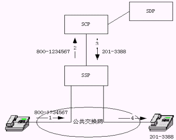 該圖示業(yè)務工作過程如下:(1)主叫用戶撥800號號碼,(2)SSP向SCP查詢800號號碼,(3)SCP查詢數(shù)據(jù)庫后向SSP送回譯碼結果(真正被叫號碼),(4)SSP連接主、被叫,振鈴。