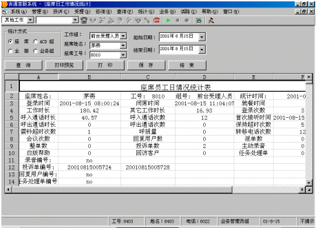 指定坐席的工作狀態(tài)(坐席工號(hào)、分機(jī)號(hào)碼、業(yè)務(wù)類型、忙閑狀態(tài)、通話時(shí)長等)