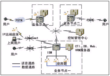 每個業(yè)務節(jié)點都由ISM(智能交換模塊)、CTI服務器、DB(數(shù)據(jù)庫)、VRM(語音資源模塊)和座席等模塊構(gòu)成,下面逐一介紹各模塊的作用和功能。