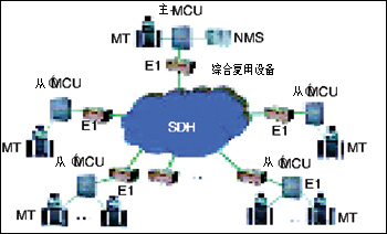 多點(diǎn)視頻會(huì)議系統(tǒng)主要由視聽多媒體會(huì)議終端MT、通信傳輸網(wǎng)絡(luò)SDH、網(wǎng)絡(luò)節(jié)點(diǎn)的多點(diǎn)控制單元MCU、網(wǎng)絡(luò)管理系統(tǒng)NMS以及外圍設(shè)備等幾部分組成。由于通信網(wǎng)絡(luò)不同,會(huì)議電視系統(tǒng)的終端和多點(diǎn)控制單元MCU也不盡相同。例如,對于采用電路交換通信網(wǎng)絡(luò)的多點(diǎn)會(huì)議系統(tǒng)通過MCU實(shí)現(xiàn),而包交換通信網(wǎng)絡(luò)則通過多點(diǎn)會(huì)議服務(wù)器來實(shí)現(xiàn)多方會(huì)議。如圖: