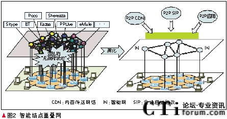 智能節(jié)點(diǎn)重疊網(wǎng)是覆蓋在IP核心網(wǎng)上的傳統(tǒng)的彈性重疊網(wǎng)(RON)技術(shù)與分布式哈希表(DHT)技術(shù)相結(jié)合的新型重疊網(wǎng)技術(shù),包括自動組網(wǎng)、網(wǎng)絡(luò)資源管理、路由優(yōu)化等關(guān)鍵技術(shù)。其基本結(jié)構(gòu)是保持TCP/IP協(xié)議不變,原來的3層變成3-層,在其上建立一個(gè)智能結(jié)點(diǎn)重疊網(wǎng)做為3+層,在此分布式管理平臺上提供流量監(jiān)控、流量控制、QoS、病毒防止和安全性等服務(wù)。智能結(jié)點(diǎn)重疊網(wǎng)的另外一個(gè)任務(wù)是為各種P2P應(yīng)用提供支撐環(huán)境。它可以為在互聯(lián)網(wǎng)上采用不同協(xié)議和軟件的各種P2P業(yè)務(wù),提供統(tǒng)一的支撐環(huán)境。主要是提供P2P CDN和P2P SIP。智能結(jié)點(diǎn)重疊網(wǎng)如圖2所示。
