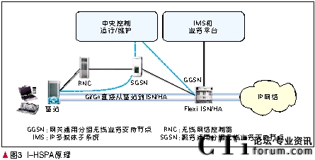 Mb/s為例,一個(gè)1 500個(gè)扇區(qū)的HSDPA網(wǎng)絡(luò)所產(chǎn)生的數(shù)據(jù)量為21.6 Gb/s。目前業(yè)界RNC的數(shù)據(jù)吞吐量僅達(dá)到1 Gb/s。今天各運(yùn)營商建設(shè)的3G網(wǎng)絡(luò)與2G共用核心網(wǎng),其帶寬和數(shù)據(jù)處理能力遠(yuǎn)遠(yuǎn)不能滿足HSPA高數(shù)據(jù)率的需求。當(dāng)數(shù)據(jù)負(fù)荷激增時(shí)運(yùn)營商將面對RNC/SGSN的擴(kuò)容的巨大壓力。此外在每一個(gè)節(jié)點(diǎn)處對數(shù)據(jù)包的重新拆裝會導(dǎo)致在每一節(jié)點(diǎn)都要引入額外的時(shí)延。結(jié)果會產(chǎn)生較長的網(wǎng)絡(luò)時(shí)延。對于移動互聯(lián)網(wǎng)應(yīng)用,這種多層次的網(wǎng)絡(luò)結(jié)構(gòu)是沒有必要的。使網(wǎng)絡(luò)扁平化不僅可以簡化設(shè)備降低成本,還可以減少時(shí)延。I-HSPA應(yīng)運(yùn)而生。這種架構(gòu)把基站通過Gi/Gn口直接連接到GGSN節(jié)點(diǎn)(通向互聯(lián)網(wǎng)和數(shù)據(jù)業(yè)務(wù)的網(wǎng)關(guān))[5]。I-HSPA原理如圖3所示。