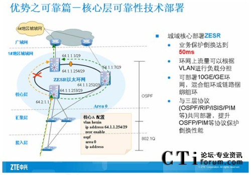 核心交換機(jī)主要是匯聚下行的全千兆智能路由交換機(jī),所以要求設(shè)備提供高密度板卡和線(xiàn)速轉(zhuǎn)發(fā)的能力。同時(shí)保證對(duì)下行端口進(jìn)行帶寬控制,中興采用萬(wàn)兆路由交換機(jī)ZXR10 8905來(lái)滿(mǎn)足用戶(hù)的需求。ZXR10 8900系列萬(wàn)兆路由交換機(jī)是中興通訊推出的新一代的大容量核心/匯聚路由交換機(jī)系列產(chǎn)品,主要定位于運(yùn)營(yíng)商IP城域網(wǎng)、校園網(wǎng)、電子政務(wù)網(wǎng)和大型企事業(yè)網(wǎng)等網(wǎng)絡(luò)的核心/匯聚層。ZXR10 8900系列萬(wàn)兆路由交換機(jī)基于先進(jìn)的模塊化理念進(jìn)行設(shè)計(jì),并采用了基于多處理器并行處理機(jī)制和Crossbar空分交換結(jié)構(gòu)的體系結(jié)構(gòu),關(guān)鍵模塊均采用可以1:1進(jìn)行冗余備份。ZXR10 8900系列具備10GE、GE、FE等各種豐富的接口模塊,并全面支持IPv4、IPv6、組播、QOS、帶寬控制等業(yè)務(wù)功能。ZXR10 8900系列整個(gè)系統(tǒng)所具備的高可靠性、高擴(kuò)展性、良好的業(yè)務(wù)能力等特點(diǎn),可以滿(mǎn)足各種網(wǎng)絡(luò)核心/匯聚層的建設(shè)需求。