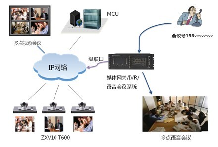 在現(xiàn)有視頻會議網(wǎng)絡(luò)基礎(chǔ)上新增語音網(wǎng)關(guān)設(shè)備,主要負責(zé)PSTN、移動網(wǎng)和IP網(wǎng)絡(luò)的信令轉(zhuǎn)接、音頻編碼的轉(zhuǎn)換、多點純語音會議、IVR會議引導(dǎo)。