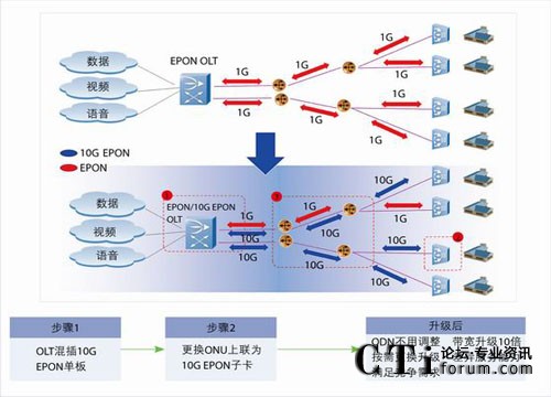 項目選取的試點小區(qū)建設于2006年,原來規(guī)劃的是每用戶6M帶寬。后期小區(qū)實裝率高,實際用戶超過1500戶,IPTV業(yè)務申請量提升后,出現(xiàn)了高峰時段IPTV點播業(yè)務不流暢、同時應用IPTV和上網(wǎng)業(yè)務時網(wǎng)速過慢等問題。而且當湖北電信新推出10M~20M的新寬帶套餐時,該小區(qū)用戶申請新套餐數(shù)量受限。該小區(qū)的寬帶接入網(wǎng)絡已經(jīng)明顯無法滿足用戶日益增長的需求,寬帶提速正當其時。選擇10G EPON,能夠簡單兩步,將小區(qū)接入方式從EPON平滑升級為10G EPON,無需改變網(wǎng)絡結(jié)構(gòu),只需簡單升級設備(見圖)。