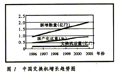 2000年,中國公用通信網(wǎng)上局用程控交換機(jī)的總?cè)萘窟_(dá)到1.79億門,國內(nèi)生產(chǎn)設(shè)備的比重達(dá)80%。預(yù)計(jì)2001年新增交換機(jī)容量2100萬門,總?cè)萘窟_(dá)到2億門,國內(nèi)生產(chǎn)設(shè)備的比重超過85%,增長(zhǎng)趨勢(shì)見圖1。