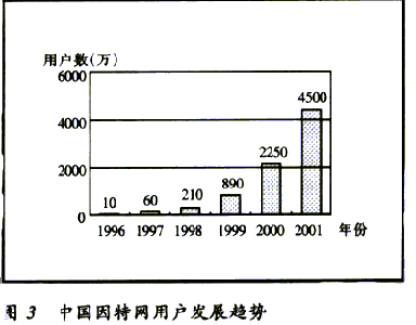 據(jù)CNNIC統(tǒng)計(jì)的數(shù)據(jù)表明,到2000年12月31日止,中國的因特網(wǎng)用戶達(dá)到2250萬戶,上網(wǎng)計(jì)算機(jī)892萬臺(tái),預(yù)計(jì)2001年中國將有超過4500萬的網(wǎng)民。中國域名總數(shù)為12.2萬個(gè),WWW站點(diǎn)數(shù)26.54萬個(gè)。中國因特網(wǎng)的發(fā)展速度驚人,與國際因特網(wǎng)的發(fā)展速度相當(dāng)。中國因特網(wǎng)用戶發(fā)展趨勢(shì)見圖3。
