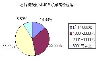 題7對(duì)終端提供商在定價(jià)方面很有幫助的,A~D的答案被選幾率分別為13.33%、33.33%、44.44%和8.89%,看來(lái)1000~3000元的價(jià)位是用戶(hù)關(guān)注的焦點(diǎn),相對(duì)于現(xiàn)在的市場(chǎng)狀況,終端廠(chǎng)商在將來(lái)MMS上面的競(jìng)爭(zhēng)環(huán)境還是比較友好的,至少價(jià)格上處于買(mǎi)方市場(chǎng),可以預(yù)計(jì)當(dāng)MMS投入運(yùn)營(yíng)的頭半年,MMS終端將維持在2500~3500元以上的檔次,6~12個(gè)月以后才會(huì)真的降到2500以?xún)?nèi)去迎合尋常百姓的消費(fèi)能力。