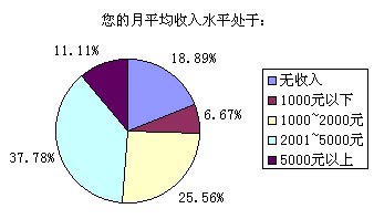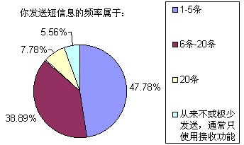 以上選擇中,選擇答案A~E的被訪(fǎng)者比例分別為18.89%、6.67%、25.56%、37.78%和11.11%,也就是說(shuō)我們這次調(diào)查的重頭是放在一般收入水平和無(wú)收入(學(xué)生)兩類(lèi)人群,這兩個(gè)人群也正是SMS市場(chǎng)上最活躍的分子。高收入和低收入人群要么因?yàn)橘Y金充裕而選擇語(yǔ)音業(yè)務(wù),要么就是因?yàn)橘Y金的缺乏而盡量不使用移動(dòng)通信方式。