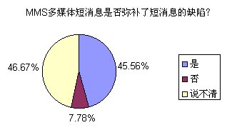 問(wèn)卷的調(diào)查結(jié)果有些屬于意料之中,有些則暫一定程度上給運(yùn)營(yíng)商和終端提供上潑了冷水。不過(guò),有一點(diǎn)是讓提供移動(dòng)服務(wù)的企業(yè)感到欣慰和滿(mǎn)意的,那就是:最終用戶(hù)對(duì)MMS的接受程度相當(dāng)高,除去對(duì)資費(fèi)、操作的質(zhì)疑外,幾乎90%以上的用戶(hù)都認(rèn)為MMS廣泛流行是一個(gè)必然的趨勢(shì)。下面我們就讀者們廣泛關(guān)注的問(wèn)題來(lái)研究一下。