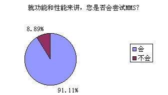 題8的調(diào)查結(jié)果對(duì)于中國(guó)移動(dòng)來(lái)講絕對(duì)是充滿(mǎn)誘惑的,高達(dá)91.11%的被訪(fǎng)者表示他們非常愿意嘗試MMS的功能和服務(wù),無(wú)疑這對(duì)ICP們(MMS服務(wù)的重要載體)也是一針強(qiáng)心劑!